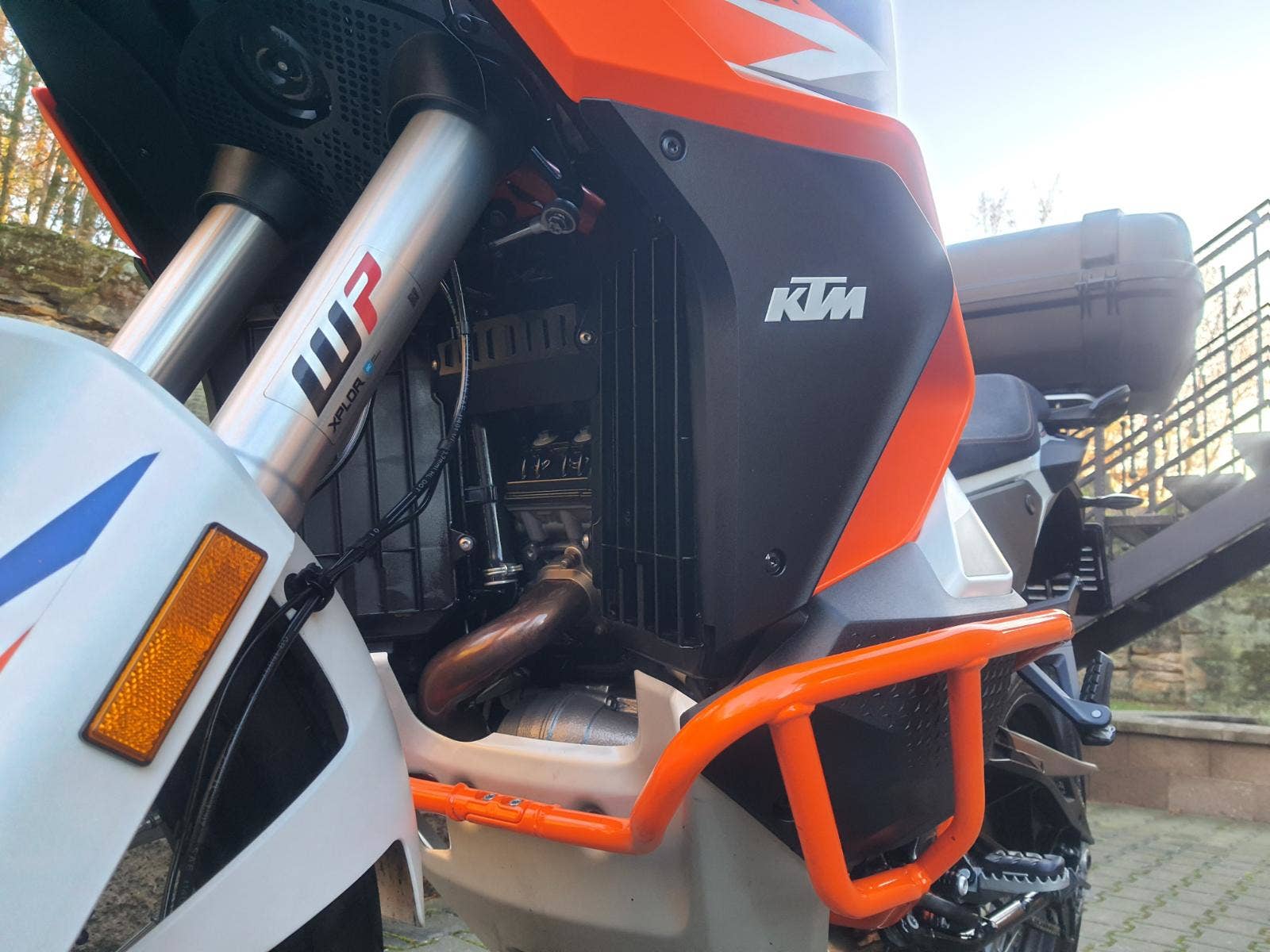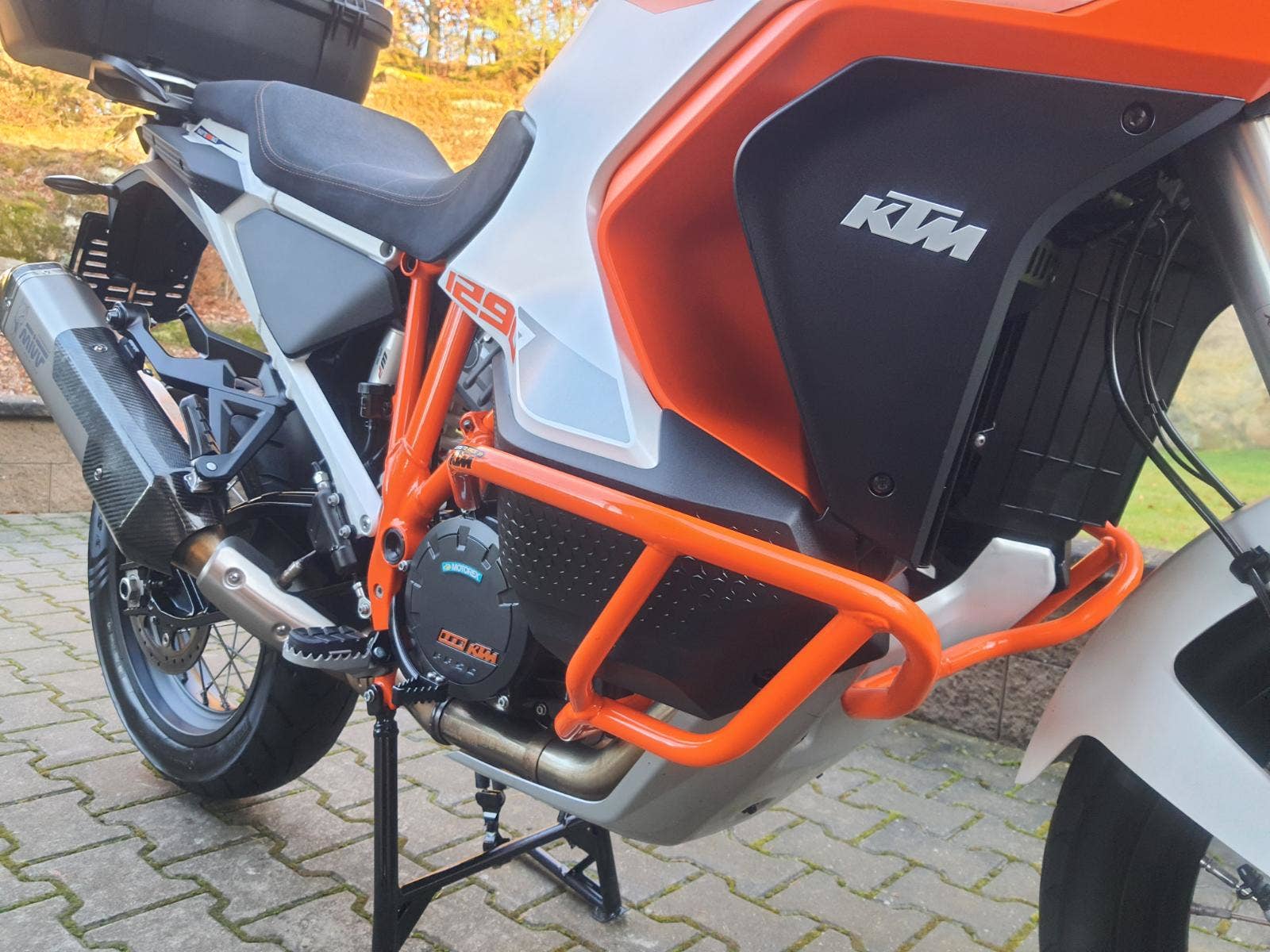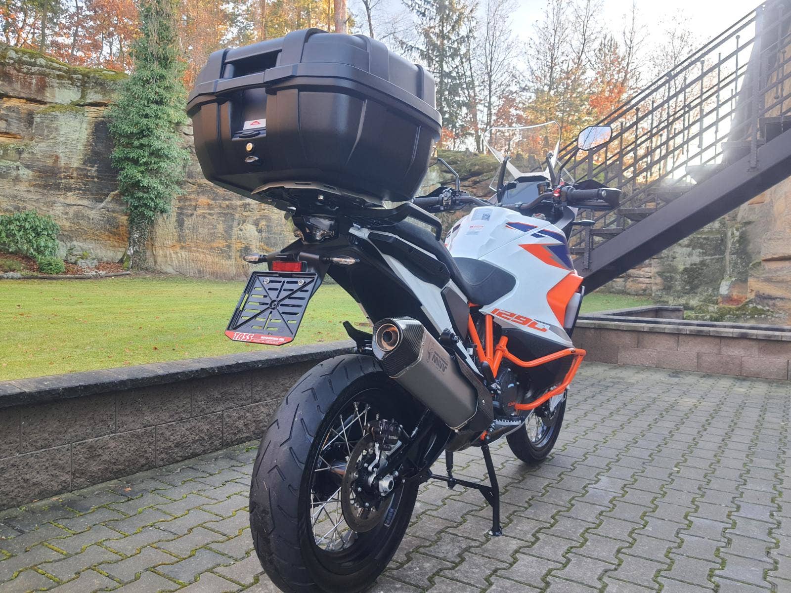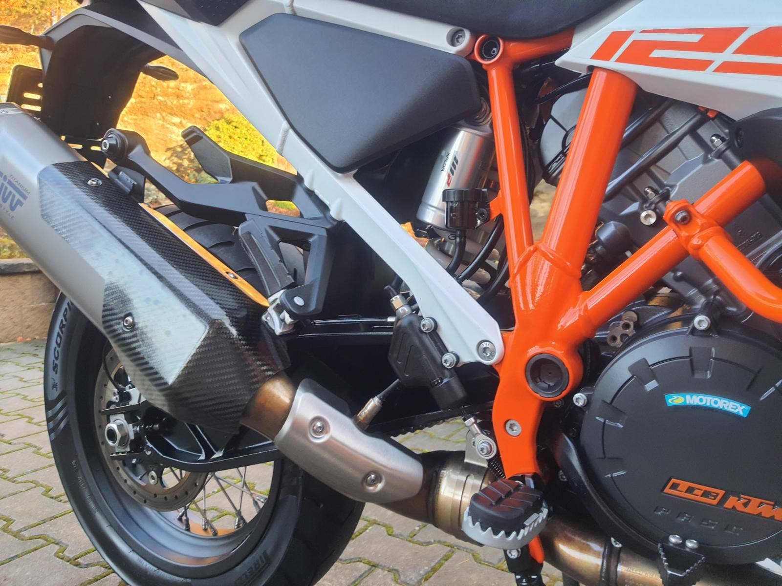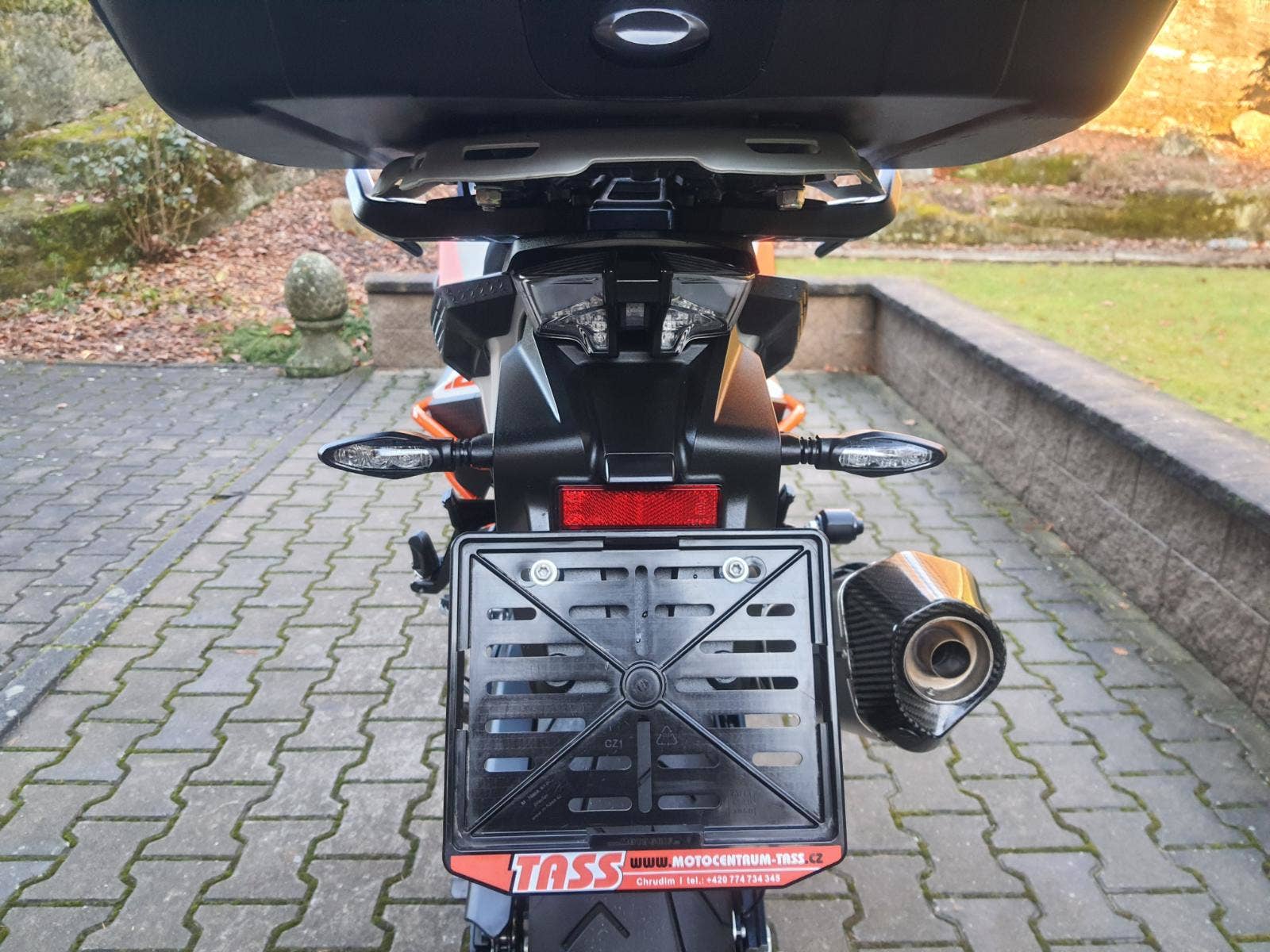 Motocykl v TOP stavu pěkné výbavěm nehavarovaný, dovezený ze zahraničí od autorizovaného pordejce. 1. manitel. 2 x klíč, elektronicky vedená servisní kniha, protokol o servisní prohlídce v KTM v 15 800 km - 08/2025, TECH PACK, pneu a řetězová sada OK. Výbava motocyklu: Padací rámy, hliníkový kryt motoru, padací rámy, kryty rukojetí, vyhřívané rukojeti, QUICKSHIFTER, noič na vrchní kufr od GIVI, + vrchní kufr KAPPA GARDA 52l, LADĚNÝ HOMOLOGOVANÝ VÝFUK MIVV, zásuvka 12V. Popis Zajímavé výhody ABS MTC Motor: Zdvihový objem1301 cm3 Max. výkon118 kW / 160 k Kroutící moment138 Nm Vrtání × zdvih (mm) 108 x 71 mm Motor4 dobý, vidlicový 2 válec, V 75° KarburaceElektronické vstřikování paliva SpojkaPASC, hydraulicky ovládaná ChlazeníKapalinové MazáníNucené olejové mazání se 3 olejovými čerpadly StartérElektrický Typ převodovky6 rychlostí, manuální EMSKeihin EMS s RBW a tempomat, dvojité zapalování CO2 emise134 g/km Spotřeba paliva5,7 l/100 km Podvozek: Provedení rámuChrom-molybdenový trubkový rám, obalovaný práškem Úhel hlavy řízení64,7° Odpružení předníWP XPLOR USD? 48 mm Odpružení zadníWP XPLOR PDS Zdvih pérování přední/zadní220/220 mm Světlá výška242 mm Výška sedla880 mm Velikost předního kolaPneu 90/90-R21 Velikost zadního kolaPneu 150/70-R18 Přední brzda2x čtyřpístkový brzdový třmen Brembo Zadní brzdaDvoupístkový pevný brzdový třmen Brembo Průměr brzdového kotouče přední /zadní320/267 mm Řetěz525 X-Ring Objem palivové nádrže (litry) 23 litrů Světlomety přední + zadníDuální LED (1 dálková/1 potkávací) Suchá hmotnost (kg) 221 kg Možnost splátkového prodeje, již při složení 10% akontace vyřízení úvěru do 30 minut!