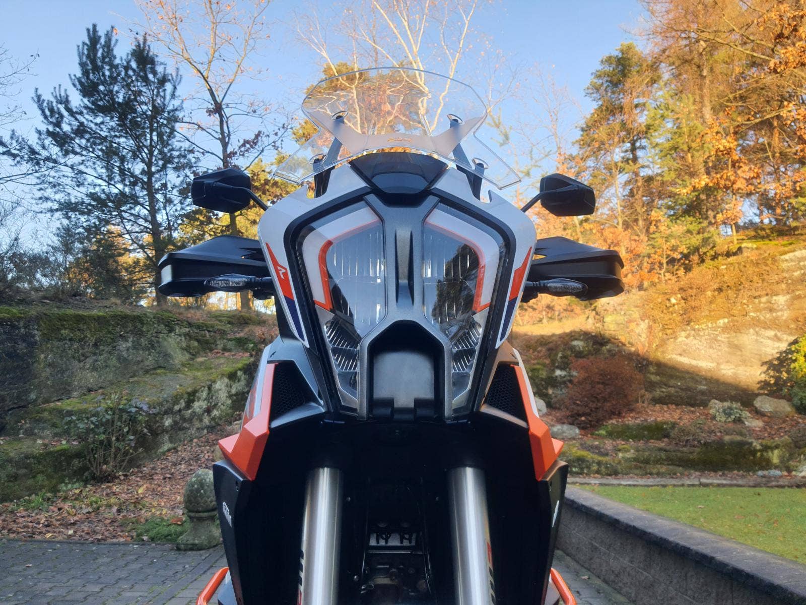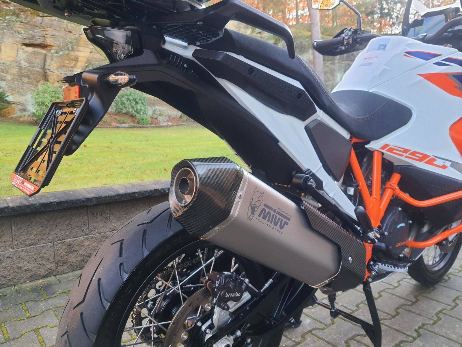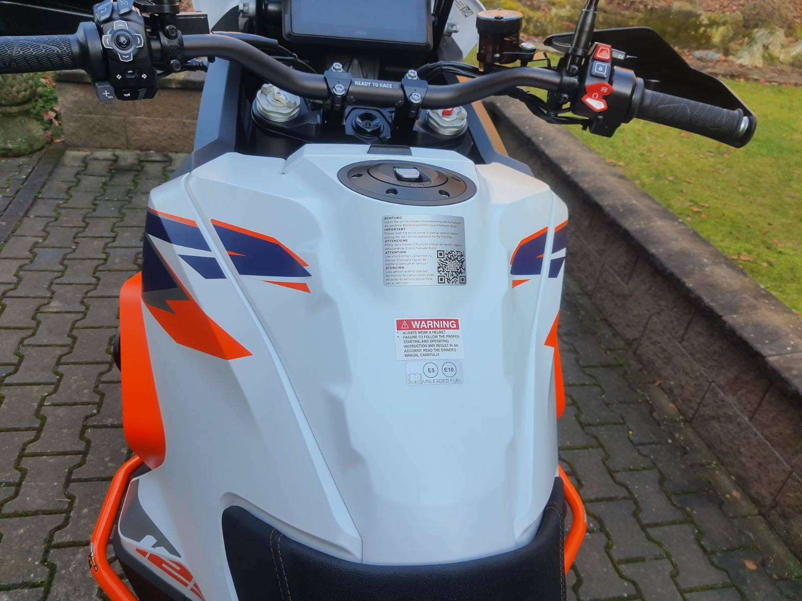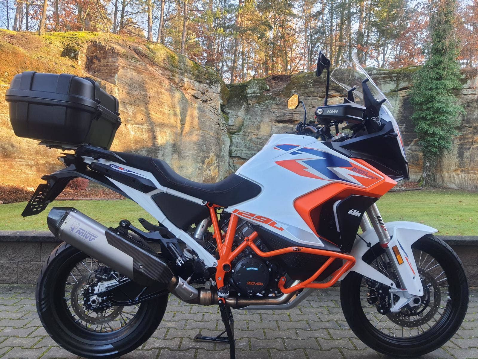Motocykl v TOP stavu pěkné výbavěm nehavarovaný, dovezený ze zahraničí od autorizovaného pordejce. 1. manitel. 2 x klíč, elektronicky vedená servisní kniha, protokol o servisní prohlídce v KTM v 15 800 km - 08/2025, TECH PACK, pneu a řetězová sada OK. Výbava motocyklu: Padací rámy, hliníkový kryt motoru, padací rámy, kryty rukojetí, vyhřívané rukojeti, QUICKSHIFTER, noič na vrchní kufr od GIVI, + vrchní kufr KAPPA GARDA 52l, LADĚNÝ HOMOLOGOVANÝ VÝFUK MIVV, zásuvka 12V. Popis Zajímavé výhody ABS MTC Motor: Zdvihový objem1301 cm3 Max. výkon118 kW / 160 k Kroutící moment138 Nm Vrtání × zdvih (mm) 108 x 71 mm Motor4 dobý, vidlicový 2 válec, V 75° KarburaceElektronické vstřikování paliva SpojkaPASC, hydraulicky ovládaná ChlazeníKapalinové MazáníNucené olejové mazání se 3 olejovými čerpadly StartérElektrický Typ převodovky6 rychlostí, manuální EMSKeihin EMS s RBW a tempomat, dvojité zapalování CO2 emise134 g/km Spotřeba paliva5,7 l/100 km Podvozek: Provedení rámuChrom-molybdenový trubkový rám, obalovaný práškem Úhel hlavy řízení64,7° Odpružení předníWP XPLOR USD? 48 mm Odpružení zadníWP XPLOR PDS Zdvih pérování přední/zadní220/220 mm Světlá výška242 mm Výška sedla880 mm Velikost předního kolaPneu 90/90-R21 Velikost zadního kolaPneu 150/70-R18 Přední brzda2x čtyřpístkový brzdový třmen Brembo Zadní brzdaDvoupístkový pevný brzdový třmen Brembo Průměr brzdového kotouče přední /zadní320/267 mm Řetěz525 X-Ring Objem palivové nádrže (litry) 23 litrů Světlomety přední + zadníDuální LED (1 dálková/1 potkávací) Suchá hmotnost (kg) 221 kg Možnost splátkového prodeje, již při složení 10% akontace vyřízení úvěru do 30 minut!